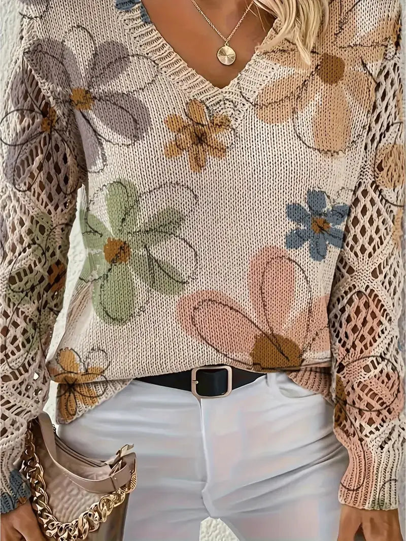 The Meadow Bloom Sweater blends bohemian charm with cozy comfort. Designed with delicate crochet sleeves and soft pastel floral patterns, it’s perfect for brightening up your casual looks. Pair it with jeans or white trousers for a fresh, feminine finish.